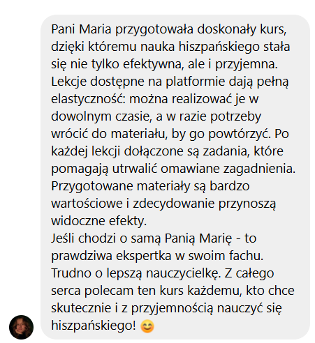 Zrobiłam wszystko, aby w prosty, logiczny i przejrzysty sposób wyjaśnić podstawy języka hiszpańskiego tak, żebyś mógł/mogła od razu używać go w codziennych sytuacjach. Jeśli będziesz systematycznie pracować z materiałami na platformie, szybko zauważysz realne postępy.