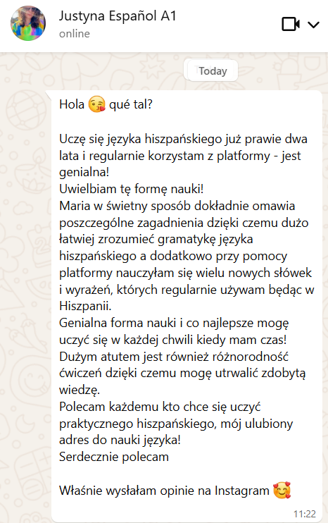 Kontakt z native speakerką + dobre tłumaczenie po polsku– uczysz się z Hiszpanką, która zna Twój język i Twoje trudności, więc wszystko jest naturalne, ale jednocześnie dobrze wytłumaczone.